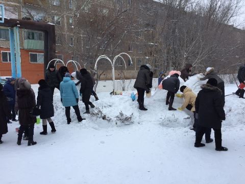 1-4 сынып мұғалімдері ата-аналарымен бірлесе отырып, мектеп ауласына қардан әртүрлі бейнелер жасады.