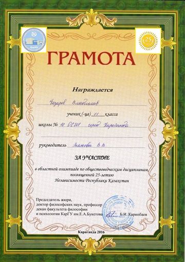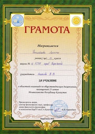 Учащихся 11 класса награждается грамотой за участие в областном олимпиаде по обществоведческим дисциплинам, посвященной 25-летию Независимости Республики Казахстан.