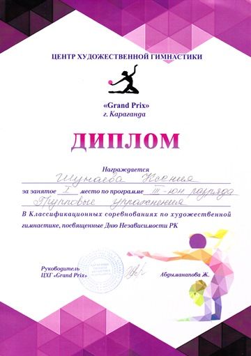Дипломом награждается учащихся 2Б класса Морозова Елизавета за занятое І место по программе ІІІ-юн.разряда в классикационных соревнованиях по художественной гимнастике.