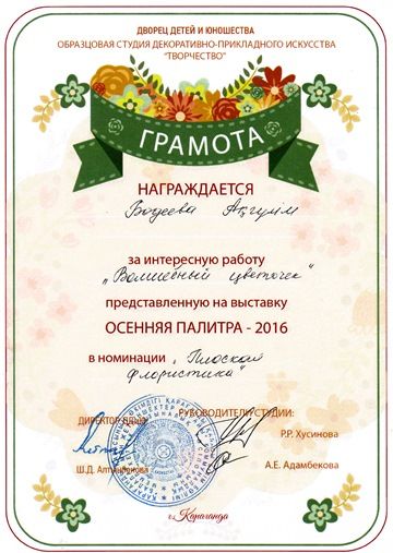 Грамотой награждается учащихся 5Ә класса А.Бодеева, А.Саяткызы за интересную работу "Волшебный цветочек" представленную на выставку "Осенняя палитра-2016".