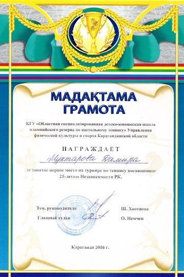Грамотой награждается Мухтаров Дамир за занятое І место на турнире по теннису посвященное 25-летию Независимости РК.