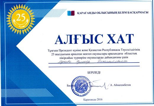 Тұңғыш Президент күніне және Қазақстан Республикасы Тәуелсіздігінің 25 жылдығына арналған мектеп оқушылары арасындағы облыстық пікірсайыс турниріне оқушыларды дайындағаны үшін бастауыш сынып м…