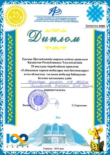 ҚР Тәуелсіздігінің 25 жылдық мерейтойына арналған "Елбасының тарихи-жобалары мен бастамалары" атты облыстық ғылыми жобалар байқауына белсене қатысқаны үшін Саможенова Виктория, Цхай…