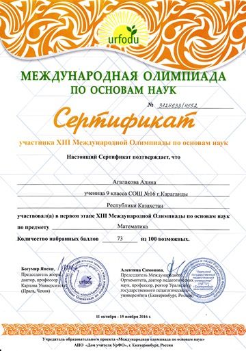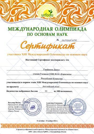 Учащиеся 9-11 классов награждены сертификатами за участие в первом этапе XІІI Международной олимпиады по основам наук.