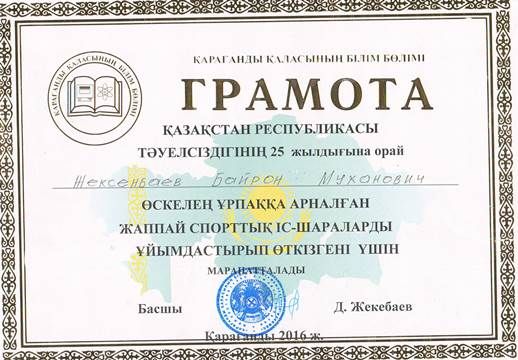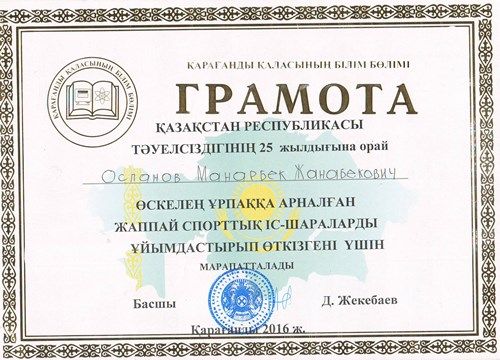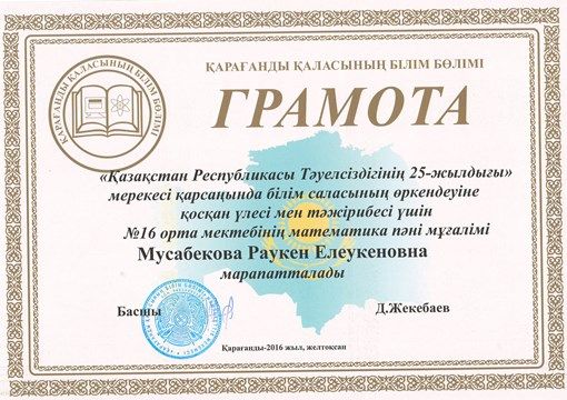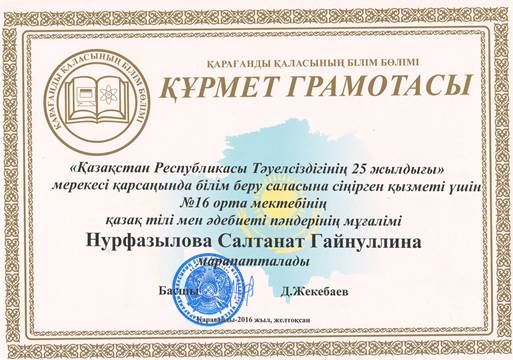 Мектебіміздің мұғалімдері Қазақстан Республикасы Тәуелсіздігінің 25 жылдығы мерекесі қарсаңында Қарағанды қаласы білім бөлімінің марапатына ие болды.