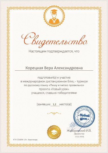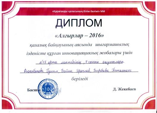 Диплом "Алғырлар-2016" қалалық байқауының аясында шығармашылық ізденісте құрған инновациялық жобалары үшін 7 сынып оқушылары Дюсенбекова Гулим, Война Ярослав, Загребова Татьянаға беріледі.…