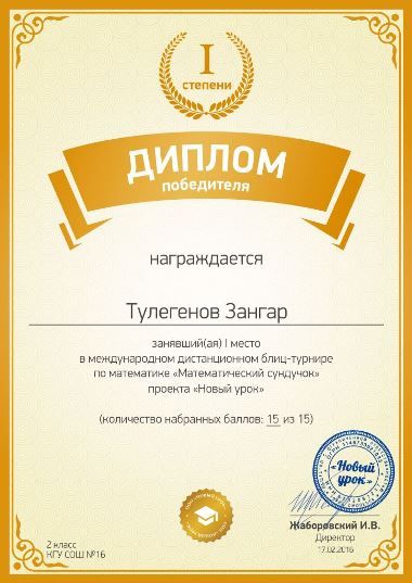 "Новый урок" жобасының математика пәні бойынша "Математический сундучок" қашықтықтан өткізілетін халықаралық блиц-турнирінде І, ІІ дәрежелі дипломдар және сертификаттармен 2 сыны…