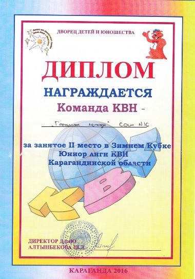 № 16 ЖББ ОМ КММ "Городские легенды" КТК командасы Қарағанды облысы КТК Юниор лигасының Қысқы кубогында ІІ орын алды. Команда мүшелері:  1. Жанакулова Амина 2. Мурат Амина 3. Обр…