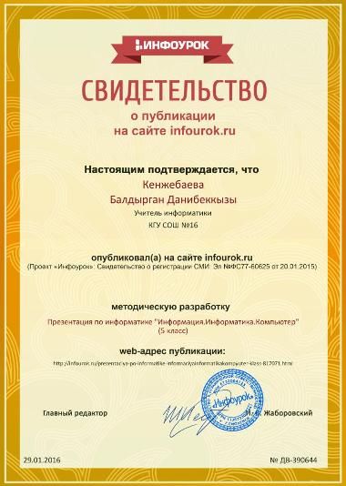 Информатика пәні мұғалімі Б.Д.Кенжебаева infourok.kz сайтында әдістемелік әзірлемелерін жариялады.