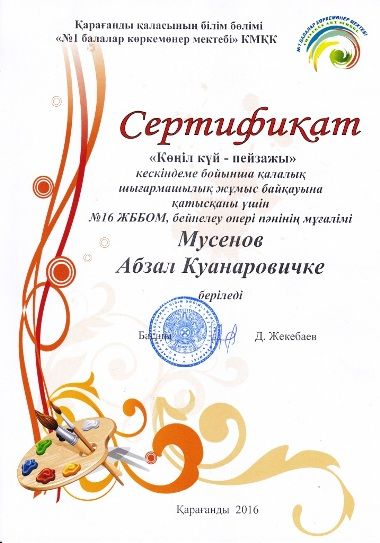 Қарағанды қаласының білім бөлімі "№1 балалар көркемөнер мектебі" КМҚК сертификатымен "Көңіл күй - пейзажы" кескіндеме бойынша қалалық шығармашылық жұмыс байқауына қатысқаны үшін…