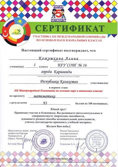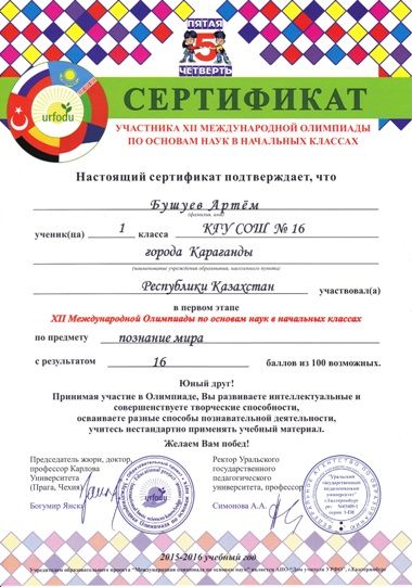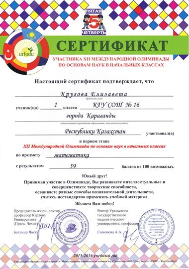 Бастауыш сыныптардың ғылым негіздері бойынша ХІІ халықаралық олимпиадасы бірінші кезеңінің қатысушыларын сертификат алуымен құттықтаймыз. Математика, орыс тілі, дүниетану пәндері. 1-2 сыныптар