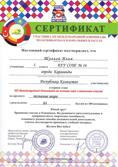 №16 ОМ 5 сынып оқушысы Қарашина Жания "Жануарлар әлемінде" атты компьютерлік презентация мен видеороликтер облыстық байқауына белсене қатысқаны үшін Алғыс хатпен марапатталды. Жетекшісі: Г…