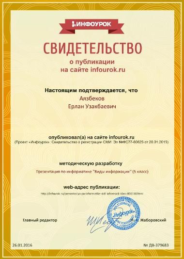 Информатика пәні мұғалімі Е.У.Аязбеков infourok.kz сайтында өз әдістемелік әзірлемелерін жариялады. Бұл 5 сыныптарға арналған "Ввод информации", "Виды информации" презен…