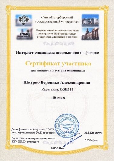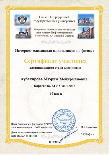 №16 ЖББ ОМ КММ 10 сынып оқушылары М.М.Аубакирова, И.Н.Кочергин, В.А.Шкурко, Т.Д.Чеботаренконы физика бойынша интернет олимпиаданың қашықтықтан өткізілетін кезеңіне қатысушы сертификатын алуларымен қ…