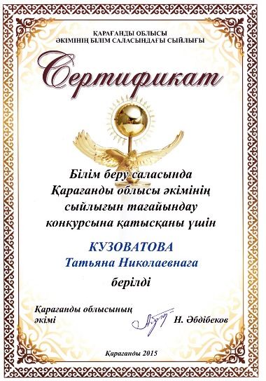 Білім беру саласында Қарағанды облысы әкімінің сыйлығын тағайындау конкурсына қатысқаны үшін Е.А.Васеневаға берілді.
