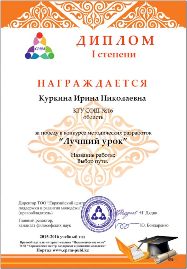 Орыс тілі мен әдебиеті пәні мұғалімдері Т.Н.Кузоватова мен И.Н.Куркина "Үздік сабақ" әдістемелік әзірлемелер байқауындағы жеңісі үшін І дәрежелі дипломмен марапатталды.