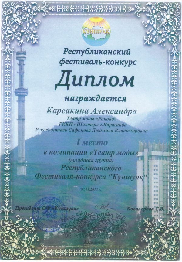 2"В" сынып оқушысы Карсакина Александра Республикалық "Күншуақ" фестиваль-конкурсында "Сән театры", "Театр" номинациялары бойынша І орын дипломы, Гран-при дип…