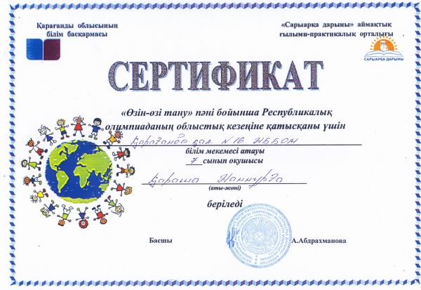 "Өзін-өзі" тану пәні бойынша Республикалық олимпиаданың облыстық кезеңіне қатысқаны үшін 9 сынып оқушысы Турдыбекова Камила, Канафина Сабина және 7 сынып оқушысы Қараша Жаннұрға берілді.&n…