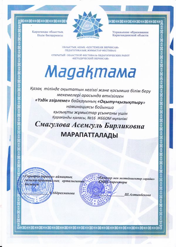 Облыстық "Әдістемелік вернисаж" байқауының "Оқыту+қызықтыру" номинациясындағы грамота