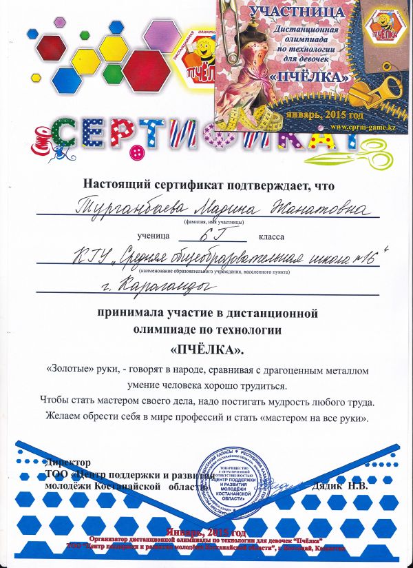 "Пчелка" қашықтықтан өткізілетін олимпиадасына қатысқаны үшін 6Г сынып оқушылары Турганбаева Мадина Жанатовна, Трошкова Олеся Вадимовна мен Эрфурт Александра Викторовна сертификатқа ие бол…