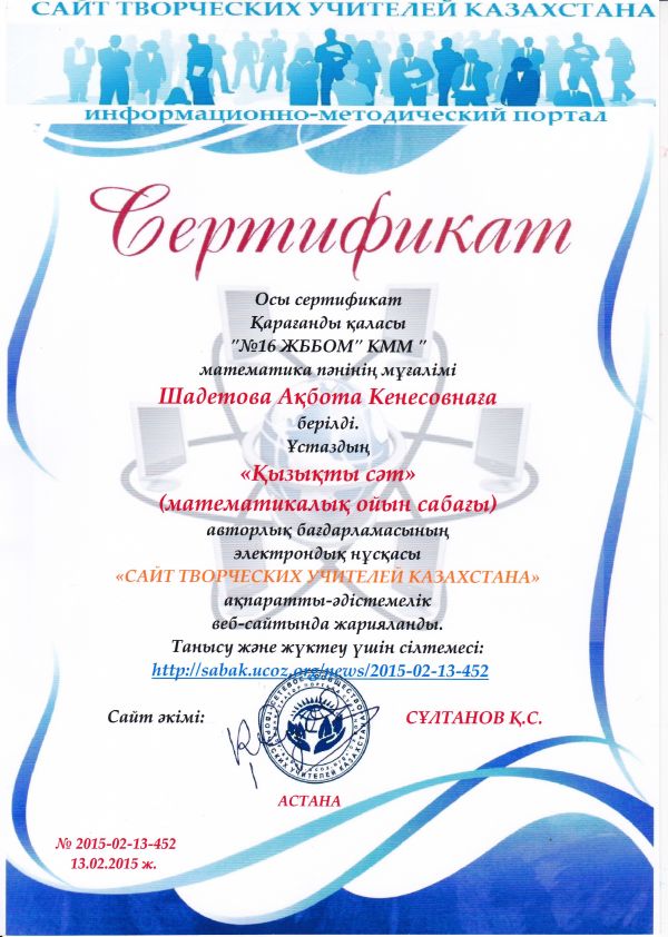 Математика пәнінің мұғалімі Шадетова Ақбота Кеңесовна "Қызықты сәт" (математикалық ойын сабағы) авторлық бағдарламасының электрондық нұсқасы "Сайт творческих учителей Казахстана"…