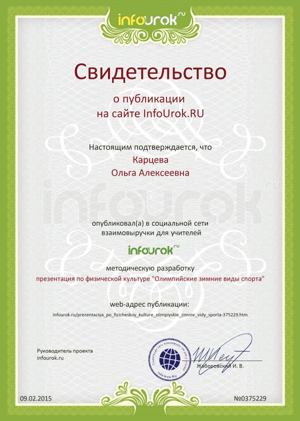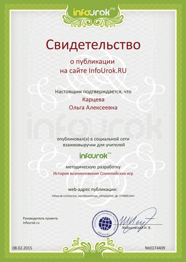 "INFOUROK.RU" сайтында "Тесты к школьной Олимпиаде по физической культуре", "Разработка по физической культуре к празднику "Игра по станциям","История возникн…