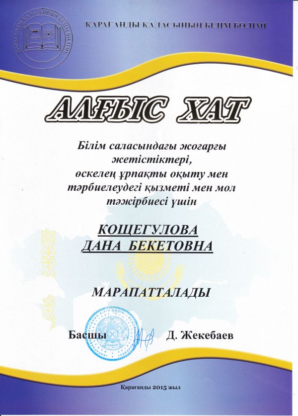 Қарағанды облысының білім басқармасы және "Болашақ" университеті № 16 ЖББ ОМ әкімшілігіне "Жас аудармашы - 2014" байқауына белсене қатысқаны үшін алғыс білдіреді.