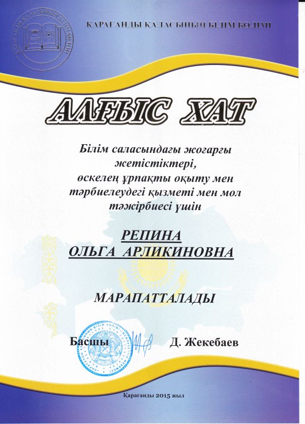 Мектебіміздің ұстаздары Кощегулова Дана Бекетовна, Струнина Валентина Константиновна, Репина Ольга Арликиновна білім саласындағы жоғарғы жетістіктері, өскелең ұрпақты оқыту мен тәрбиелеу…