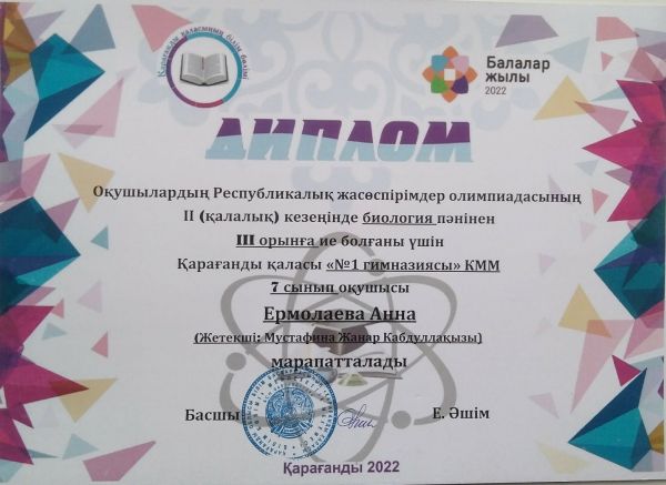 Дипломом за занятое 1 место в городском этапе республиканской юниорской олимпиады для учащихся 7-8 классов по предмету химия награждается ученица 7 класса Лысенко Александра. Учитель: Лытнева Е.Г.&n…