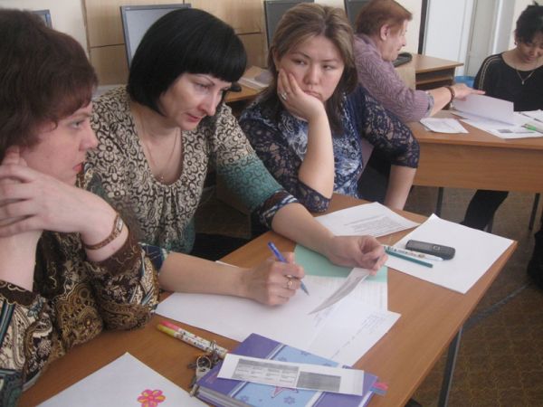 Деңгейлік курстерді бітіріп келген №1 гимназия мұғалімдері Чиркова Е.Ю мен Сүлейменова Н .И гимназия мұғалімдеріне «Критериялық бағалау оқушының білім алуд…