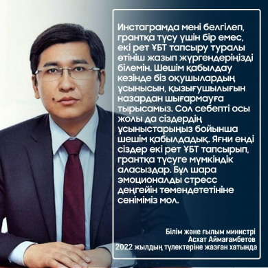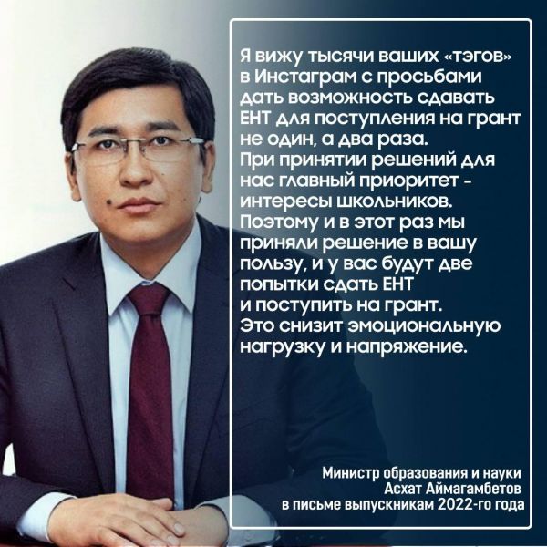 Министр Образования и Науки Асхат Аймагамбетов дал несколько советов выпускникам в выборе ВУЗа и назвал изменения в проведении ЕНТ