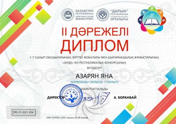 В Республиканском конкурсе проектов "Зерде" ученица 7 класса Азарян Яна заняла 2 место . Руководитель:Таловская М. Ю. Поздравляем!