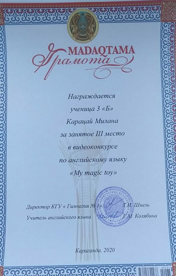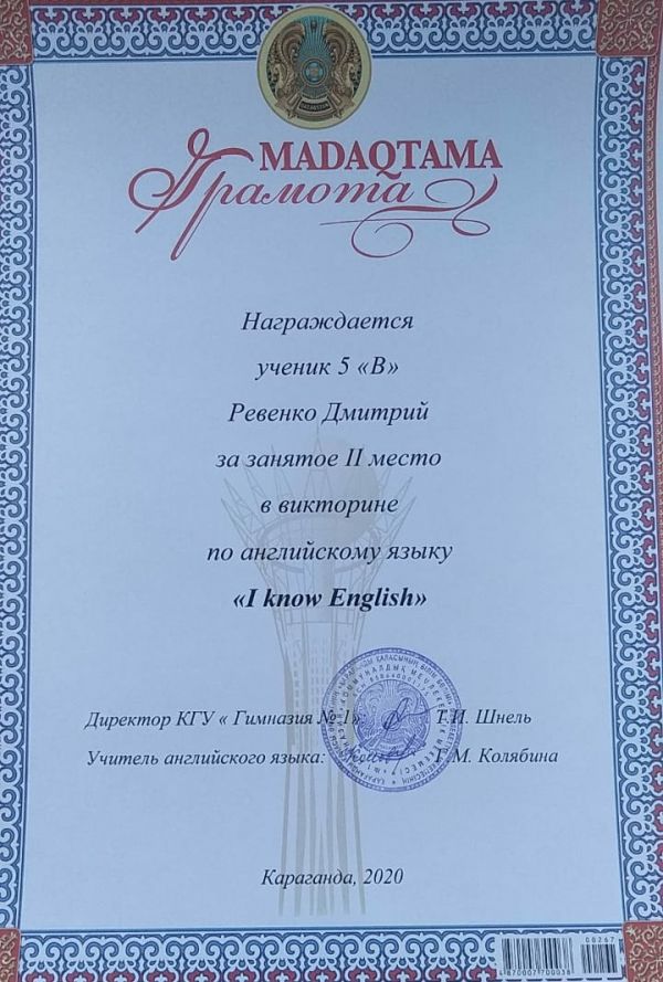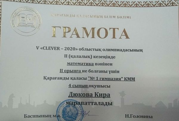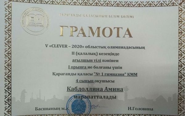 Ученица 4 класса Кабдоллина Амина заняла 1 место в городском туре в олимпиаде "Clever-2020" по английскому языку.  Ученица 4 класса Дюкова Кира заняла 2 место в городском туре в оли…