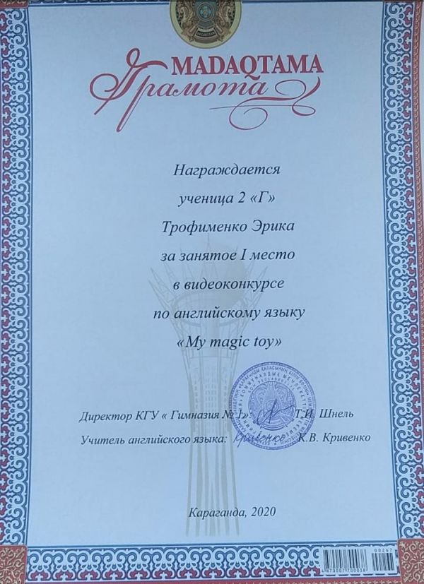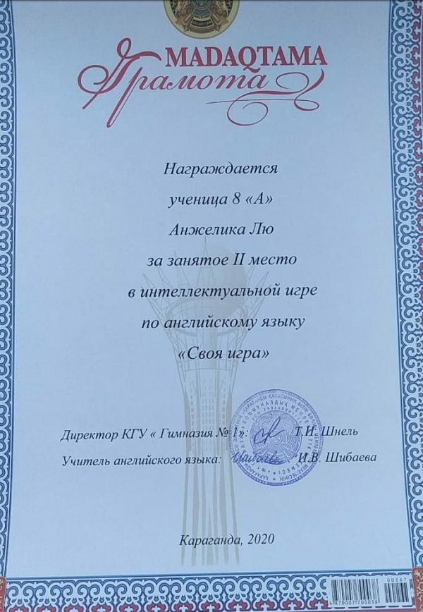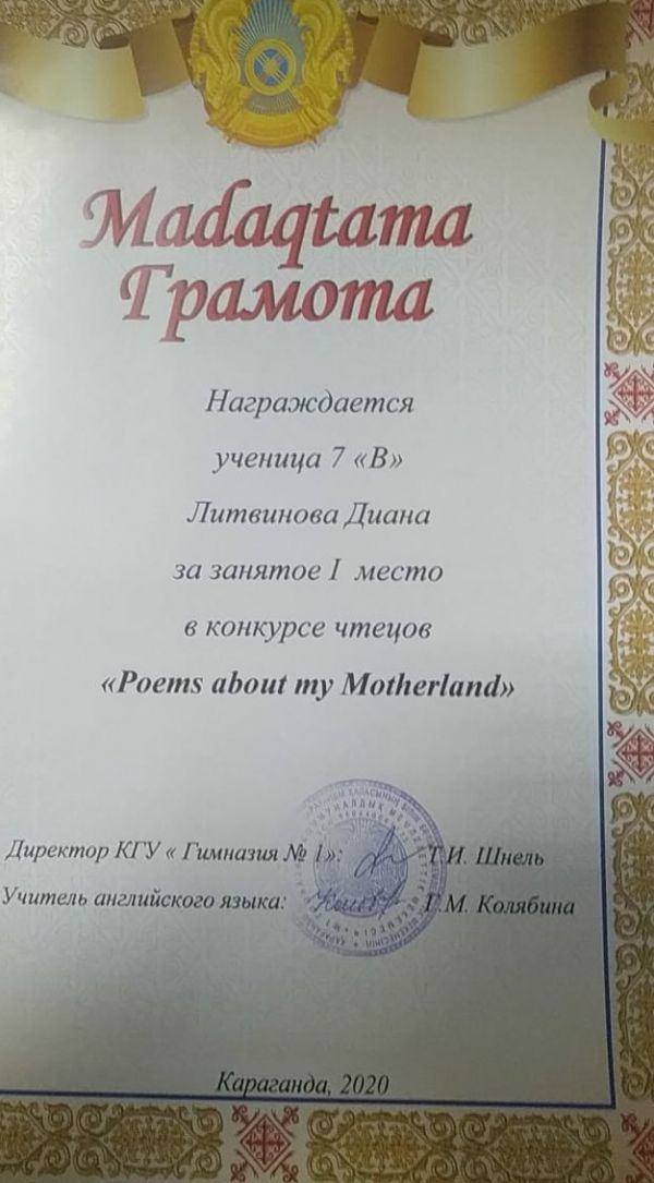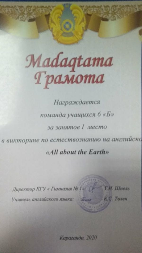 Коммунальное государственное учреждение "Гимназия №1" отдела образования города Караганды управления образования Карагандинской области