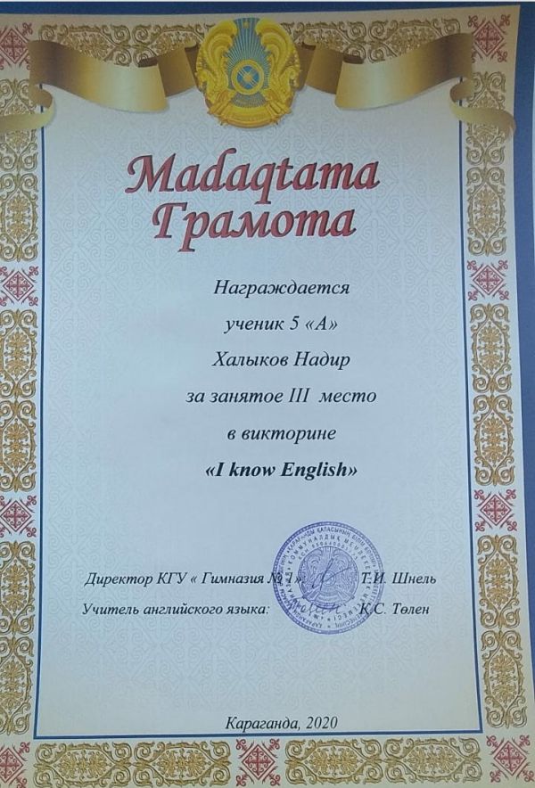 Дипломом за занятое 2 место в городском туре 1 Республиканской олимпиады среди учащихся 5-6 классов награждается Маратова Амина (5 класс) по предмету английский язык Дипломом за занятое 3 мес…