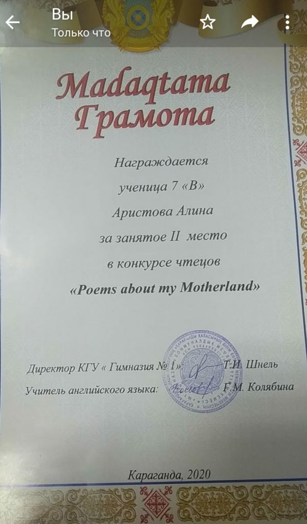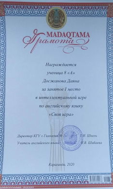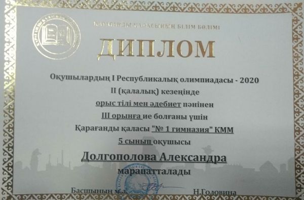 Ученица 11 "А" класса Власенко Наталья заняла 3 место в олимпиаде "Тіл білгірі" (казахский язык) среди учащихся 9-11 классов, которую проводил Карагандинский экономический универ…