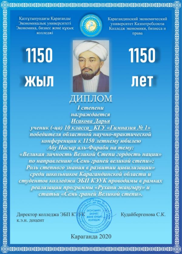 Ученицы 10 Б класса КГУ "ГИМНАЗИЯ 1"Исакова Дарья и Персикова Екатерина защищали проект на научно-практической конференции, посвящённой1150 летнему юбилею Абу Насыр аль Фараби и заняли 1 м…