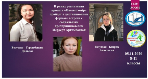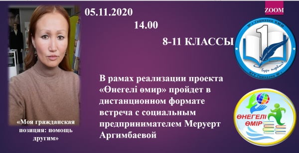 05 ноября 2020 года в 14.00 учащиеся 8-11 классов приглашаются на встречу в дистанционном формате с социальным предпринимателем Меруерт Аргимбаевой.