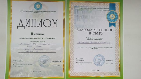 Курган Алина, Бауэр Александра и Оразбаев Аян (учитель Александров А.А.) награждены Дипломом 2 степени, Благодарственным письмом и призами за участие в интеллектуальной онлайн игре «Я -эколог&…
