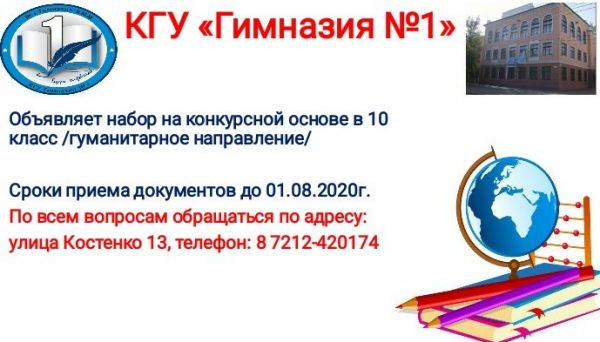 КГУ "Гимназия №1"объявляет набор на конкурсной основе в 10 класс /гуманитарное направление/