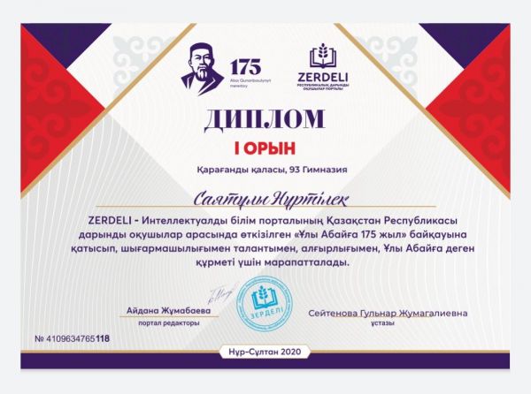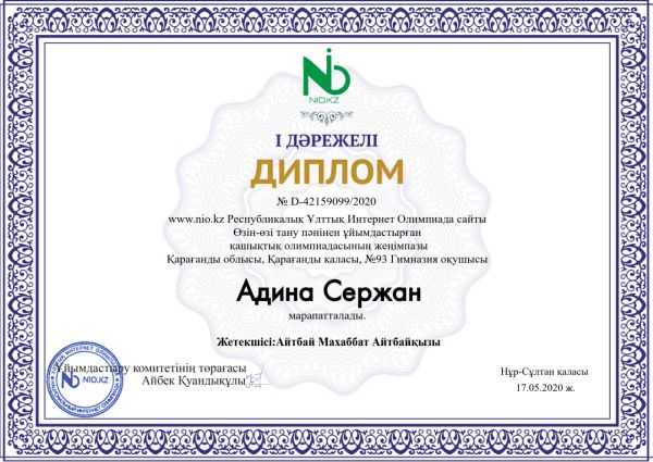 АДИНА, ҚҰТТЫ БОЛСЫН! Қашықтықтан оқу - оқушыларымыздың интеллектуалдық олимпиадалар мен байқауларға қатысып, биік жетістіктерге жетуге тамаша мотивация. Осындай Республикалық  "Ұлттық Ин…