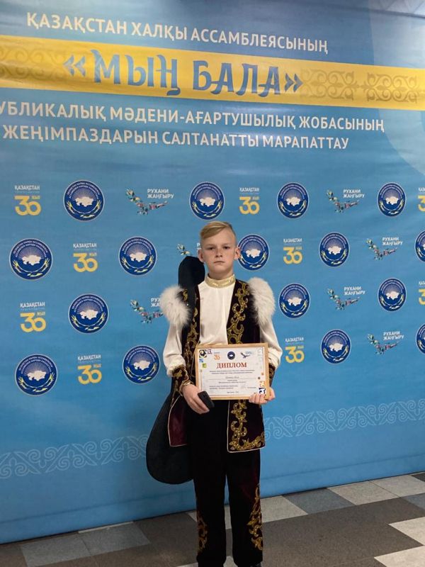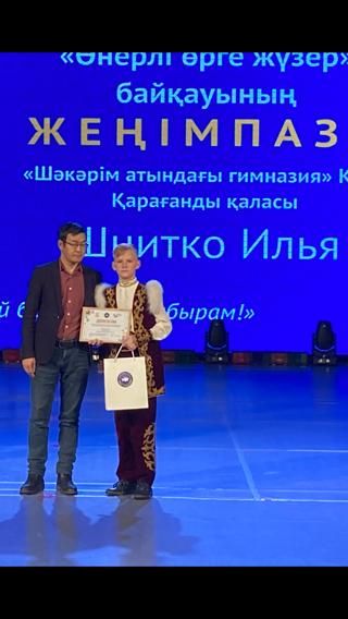 Республикалық “Мың бала” мәдени-ағартушылық жобасының республикалық кезеңінің жеңімпазы “Шәкәрім атындағы гимназия”КММ 7-сынып оқушысы Шнитко Илья. Қазақтың қара домбырасын қ…