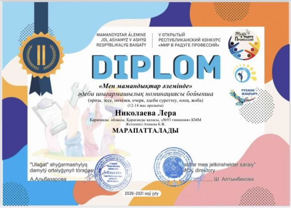 "Мамандықтар әлеміне жол ашамыз" атты V ашық Республикалық байқауға қатысып, әдеби шығармашылық номинациясы бойынша "93 гммназия"КММ 2 В оқушысы Еркін Көркем, 7 Е сынып оқушысы Гнедин Владимир 1дәре…