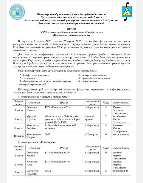 В апреле месяце на базе факультета математики и информационных технологий КарГУ им. Е.А.Букетова проходил 26 областной заочный конкурс исследовательских проектов "Высшая математика и школа", в котором…