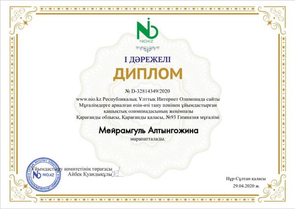 Поздравляем педагога-психолога нашей гимназии Алтынгожину Мейрамгуль Серикболкызы за занятое первое место по итогам участия в профессиональном конкурсе NIO и желаем дальнейших творческих успехов.