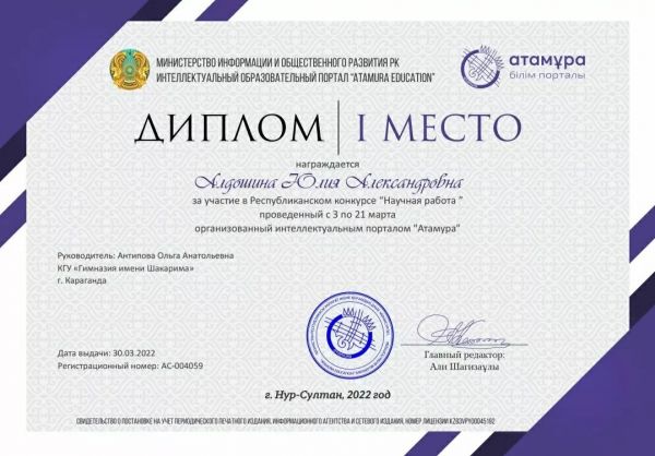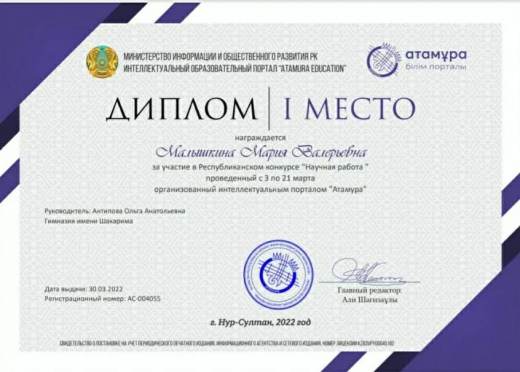 ученица 9В класса Морозова Майя 31 марта 2022 г. приняла участие в Олимпиаде по немецкому языку Гете-Института Казахстан и заняла 2 место.