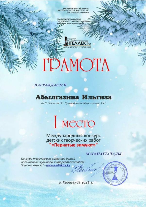ӨНЕРІ ӨРГЕ ӨРЛЕСІН! Қарағанды қаласы, 93 гимназияның 1 В сынып оқушысы АБЫЛГАЗИНА ИЛЬГИЗА Халықаралық байқауда биіктен көрінді. Оның қылқаламынан шыққан туындысы 1 орынды жеңіп алды. Өнерлерімен өрге…