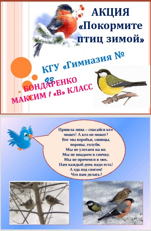 #құстарғакөмектесейік #покормитептицзимой МЕЙІРІМ ТӨККЕН БАЛА ЖҮРЕГІ Қарағанды қаласы, 93 гимназияның 5 Д сынып оқушылары СТАРОСТИНА ДАРЬЯ мен ЛЕГЛИАЗ ВИКТОРИЯ-ДАНА мейірімділік акциясына белсене қат…