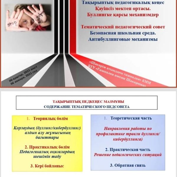 БУЛЛИНГТІҢ/КИБЕРБУЛЛИНГТІҢ АЛДЫН АЛУ Маңыздылығы мен өзектілігі өршіп тұрған мəселелердің бірі - балалар буллингі/кибербуллинг мəселесі. Осыған орай Шəкəрім гимназиясында 06-қаңтарда дире…