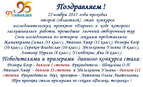 Вниманию  родителей и учащихся гимназии № 93. Сообщаем, что  7 и 8 декабря 2017 года в гимназии будет проходить второй (городской) этап Республиканской олимпиады  школьников  п…